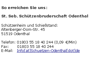 Sprechen Sie ganz einfach einen der aktiven Schützen der Bruderschaft an. Er oder Sie wird Sie informieren und Sie gerne als neuen Förderer der Bruderschaft aufnehmen. Unsere Bitte: Unterstützen Sie unsere Bruderschaft indem Sie Förderer der Bruderschaft werden und tragen Sie einer lange überlieferten Tradition und der Pflege des heimatlichen Brauchtums bei. Auch der Besuch unseres Schützenfestes trägt hierzu bei. Bringen Sie Freunde und Bekannte mit und verleben Sie schöne Stunden im Kreise der Bruderschaft. Haben Sie noch Fragen? Jeder unserer aktiven Schützen steht Ihnen gerne zur Beantwortung offener Fragen zur Verfügung, oder schicken Sie uns einfach eine E-Mail: Info[at]Schuetzen-Odenthal[dot]de |